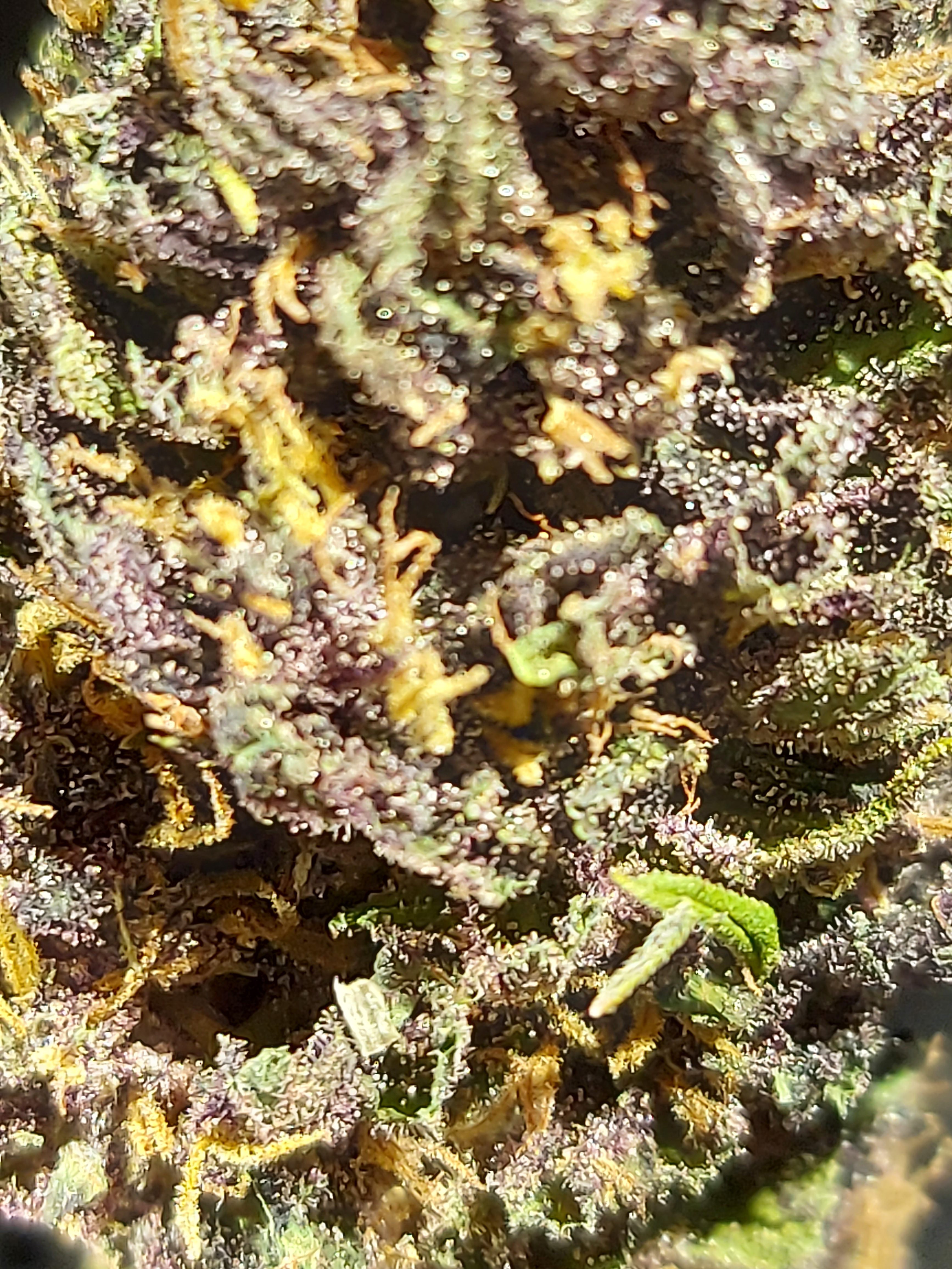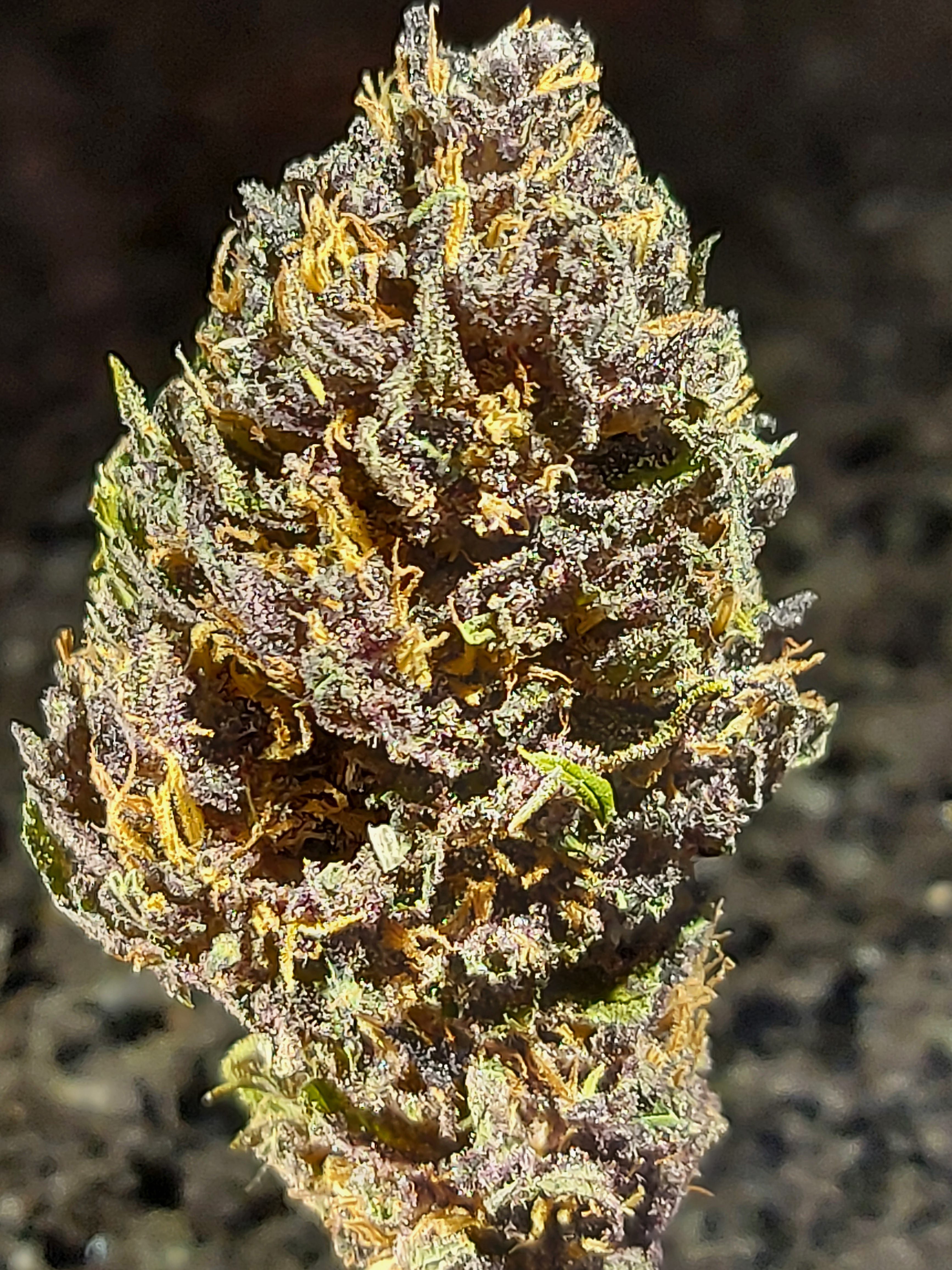 Jolie purple, compacte, avec un parfum mêlé de fruit et de gaz.
